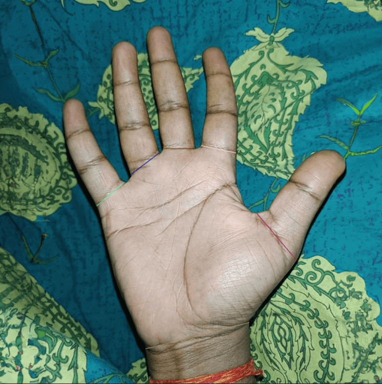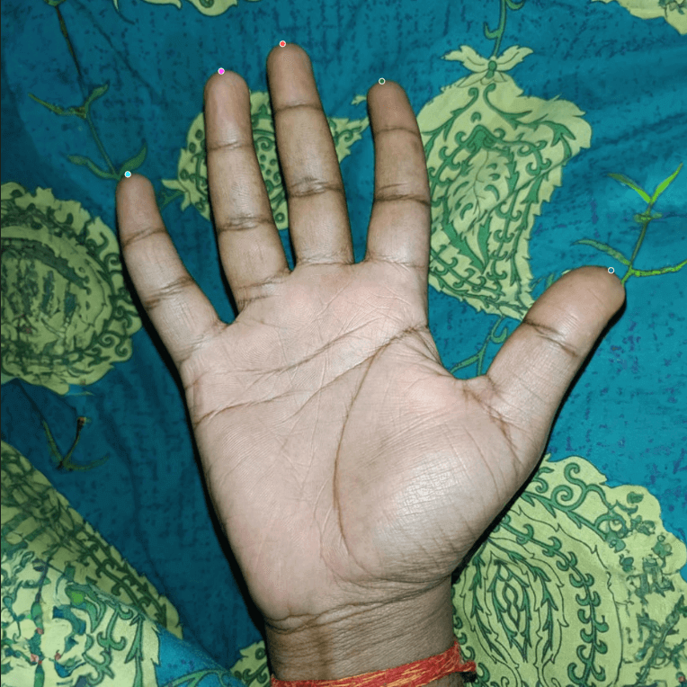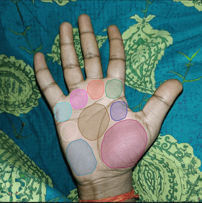 We made manual alterations to accurately identify and categorize the gaps between fingers that the automated tools could not recognize. We used Google images as references of palm lines for precise labeling. Darker or unclear images were processed by adjusting their opacity. We also passed the labeled images through an in-house QC process to ensure all required points across each palm image were correctly annotated.