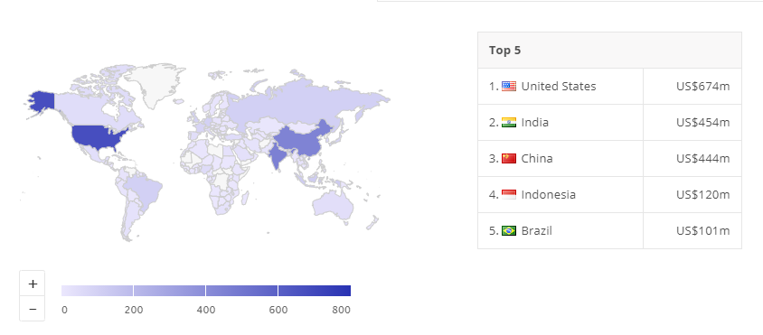- The United States will be the global leader that will generate the most revenue if USD 674 million in 2021. India is in second place with USD 454 million and China third with USD 444 million.