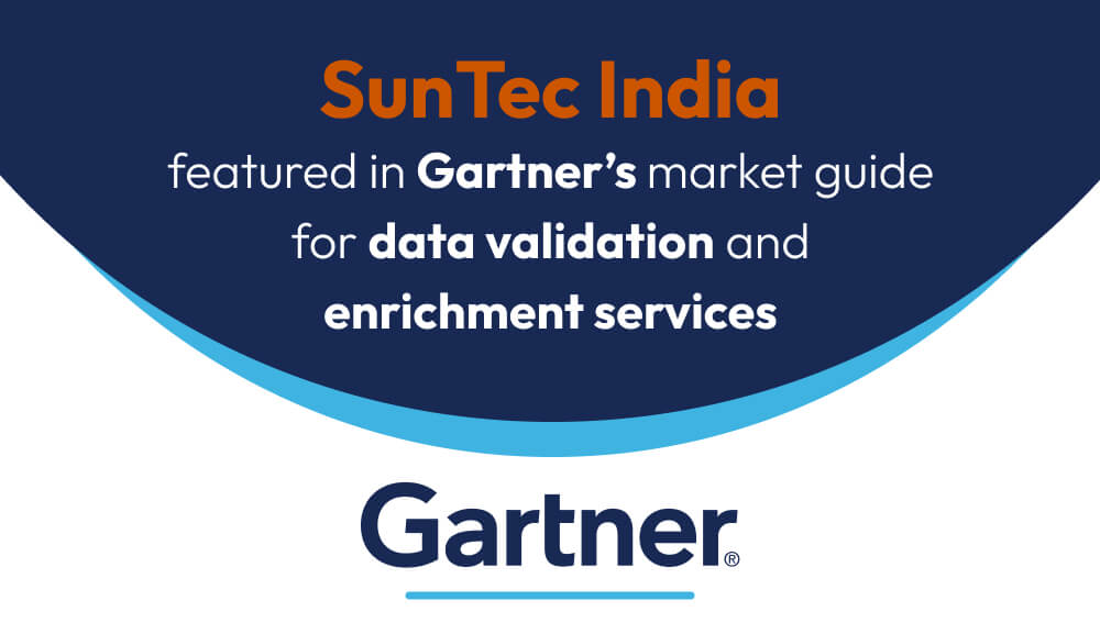 We are proud to announce that SunTec India has been recognized by Gartner as one of the top global representative vendors in the data validation and enrichment services market in their latest report "The Market Guide for Data Validation and Enrichment Services for Party Data".