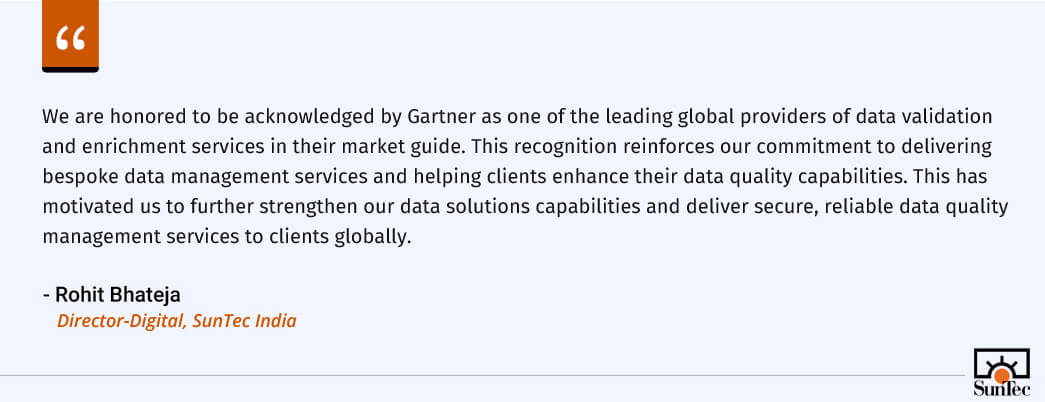 The 2022 Gartner Data Validation and Enrichment Services Survey was conducted online from 9 May through 3 June 2022. Our company was selected among the top global vendors after evaluation across parameters including expertise, proof of concepts, ROI proof points, privacy compliance, and overall data quality management capabilities. SunTec India joins other leading data services providers mainly from North America, EMEA, and Asia Pacific in Gartner's global list.