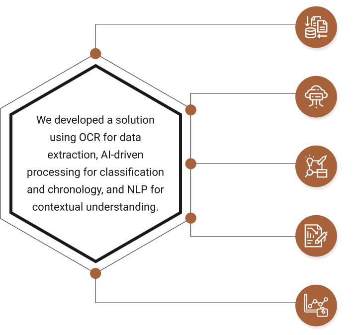 We developed a solution using OCR for data extraction, AI-driven processing for classification and chronology, and NLP for contextual understanding.