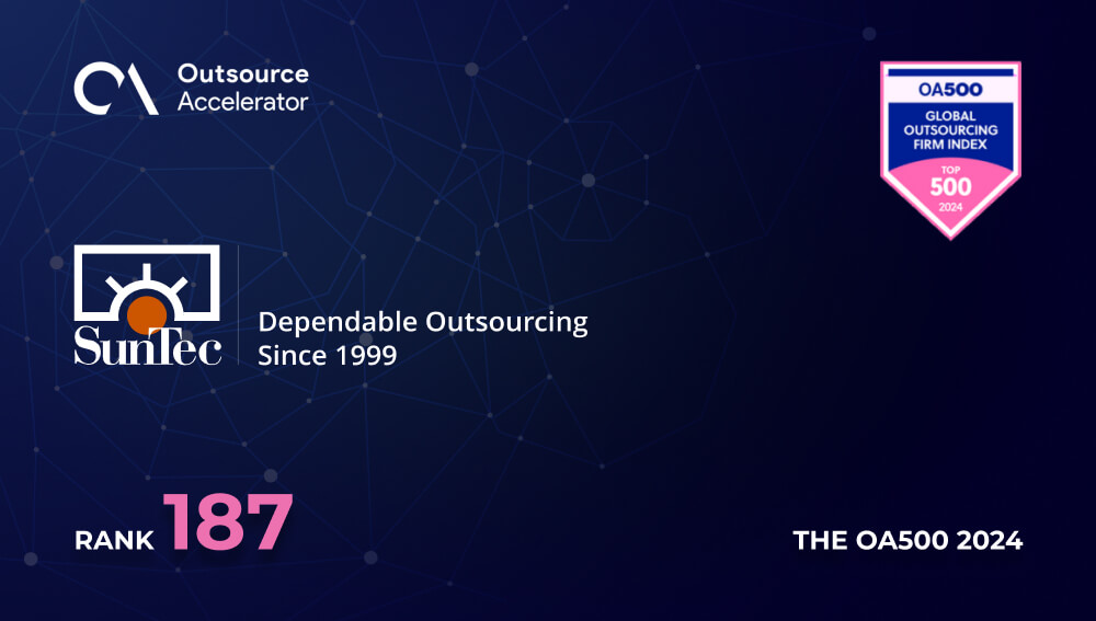We are thrilled to share that SunTec India has been recognized as one of the world's leading outsourcing service providers in the highly-regarded OA500 2024 Analysis and Ranking report published by Outsource Accelerator. We secured an impressive 187th position among the top 500 outsourcing firms globally.
